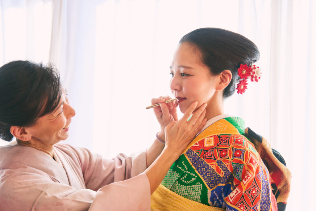 振袖着付け、ヘアメイク、小物アクセサリー花束レンタル、プロカメラマン撮影と50-100カットデータ全て、式進行イベント、お茶お菓子を含みます。