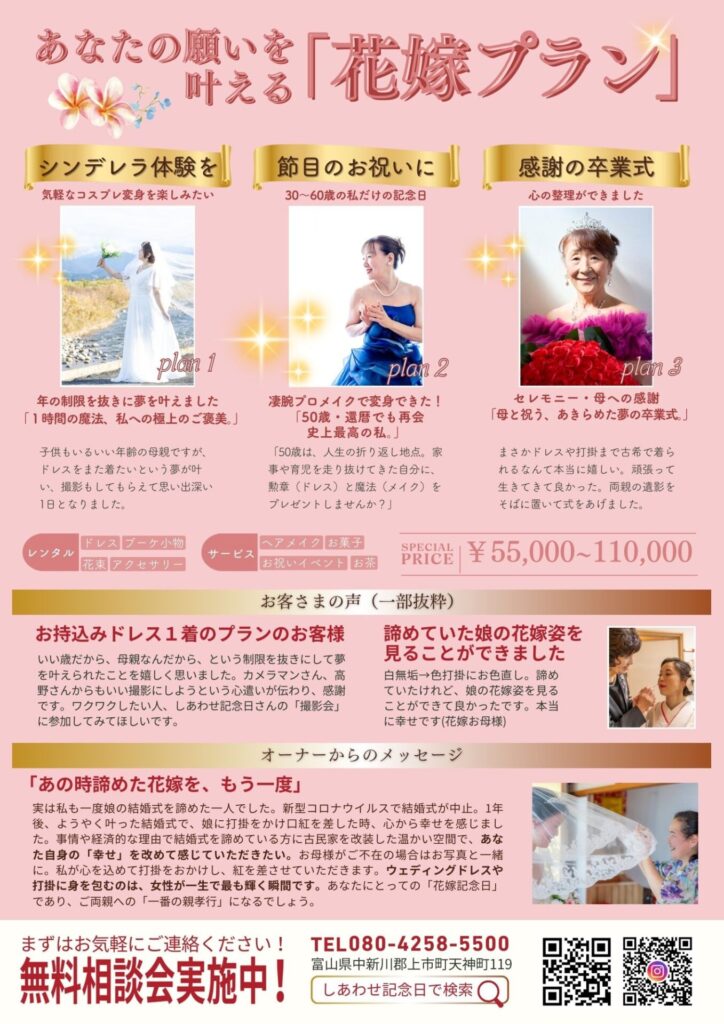 本当はドレス着たかったの、打掛も着てみたかったの、という胸の奥にしまった夢が今叶います。ドレスもSサイズからML3L5Lなど各種ございますし、白無垢や打掛も十二単タイプまで各種ございます。一度、どんな衣装があるのか、どんな撮影会なのかを見学にいらしてくださいませ。